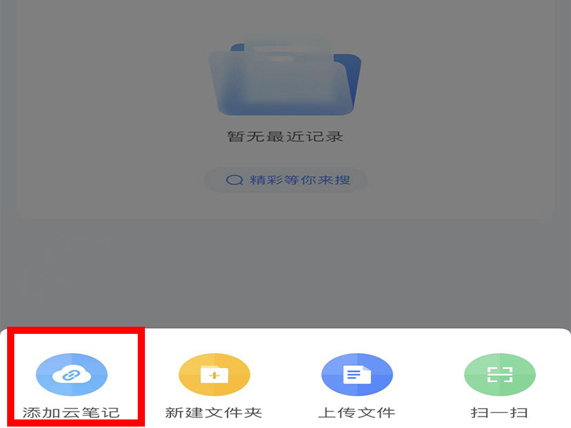 2、在下方弹出来的功能栏中点击“添加云笔记”。