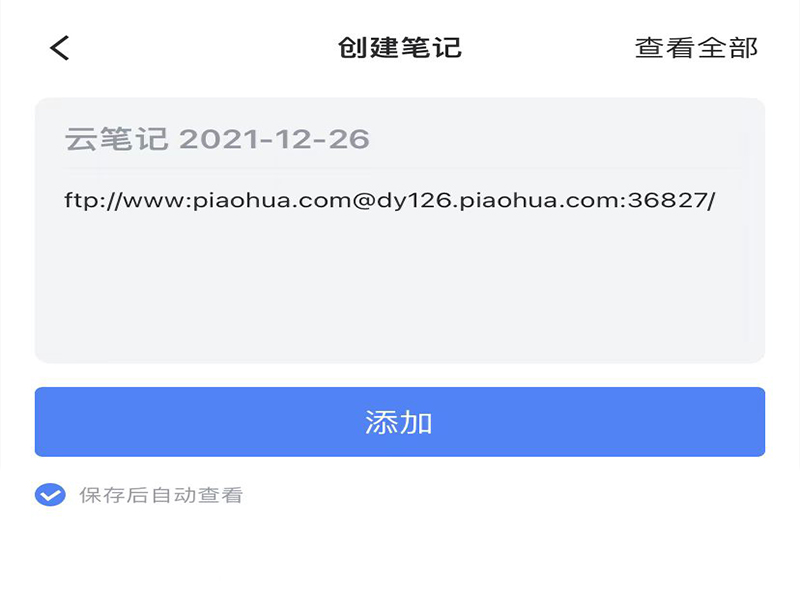 3、在“创建笔记”界面将复制的链接粘贴到“云笔记”,要勾选下方的“保存后自动查看”,再点击“添加”。