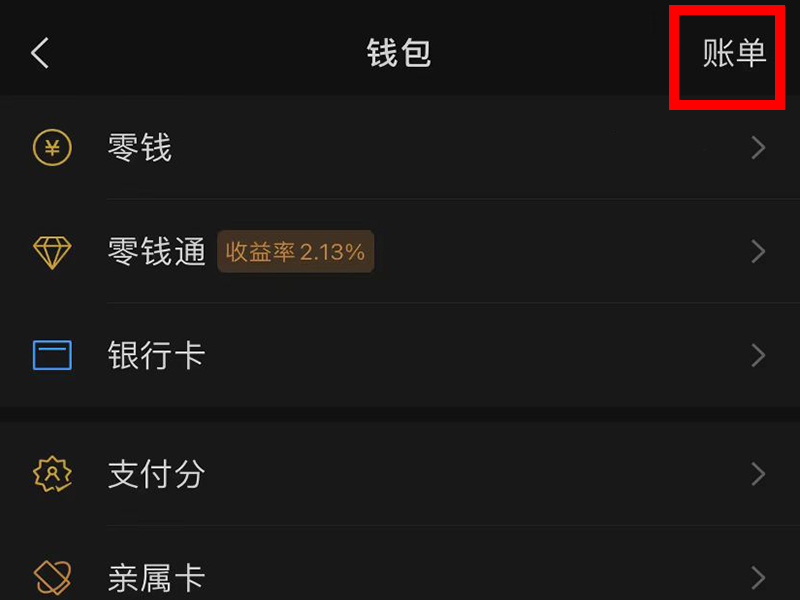 3、进入“钱包”界面后,点击右上角的“账单”。
