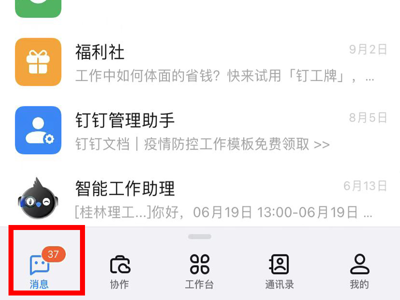 1、打开钉钉app,点击进入“消息”界面。
