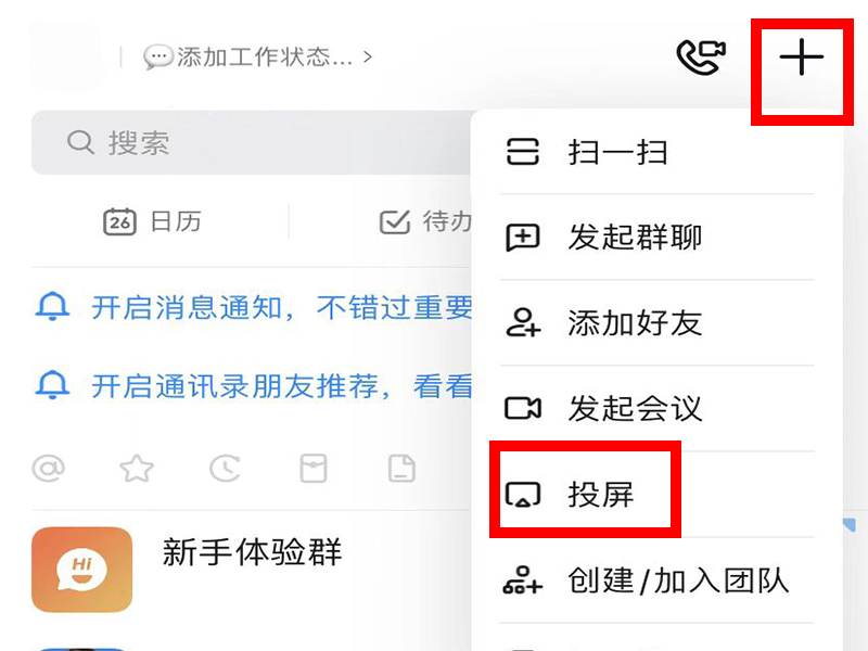 2、进入“消息”界面后,再点击右上方的“+”号,然后在弹出来的功能栏中点击“投屏”。