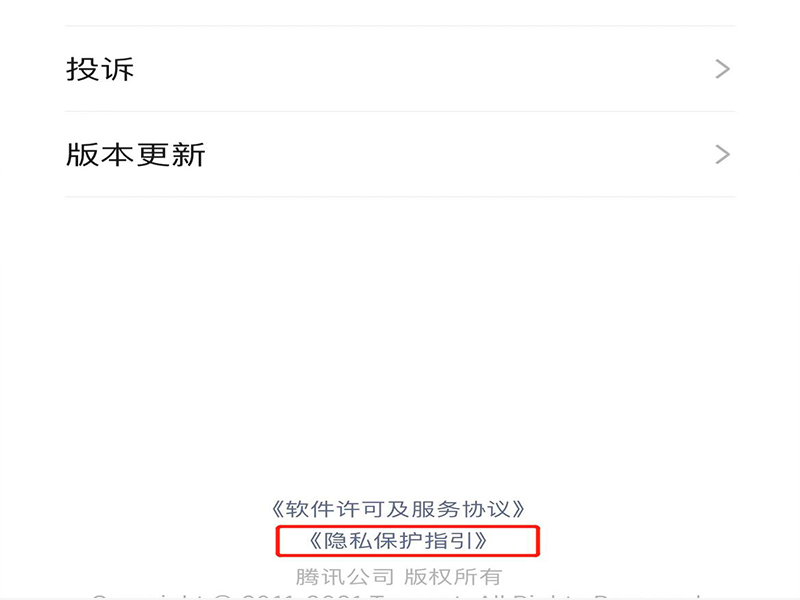 3、点击微信详情页面最下方的“隐私保护指引”,进入微信隐私保护指引页面。