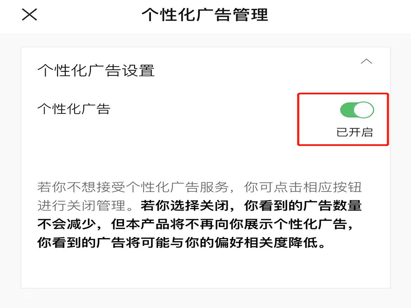 5、在个性化广告管理页面上,选择左滑浮标即可关闭个性化广告信息的推送。