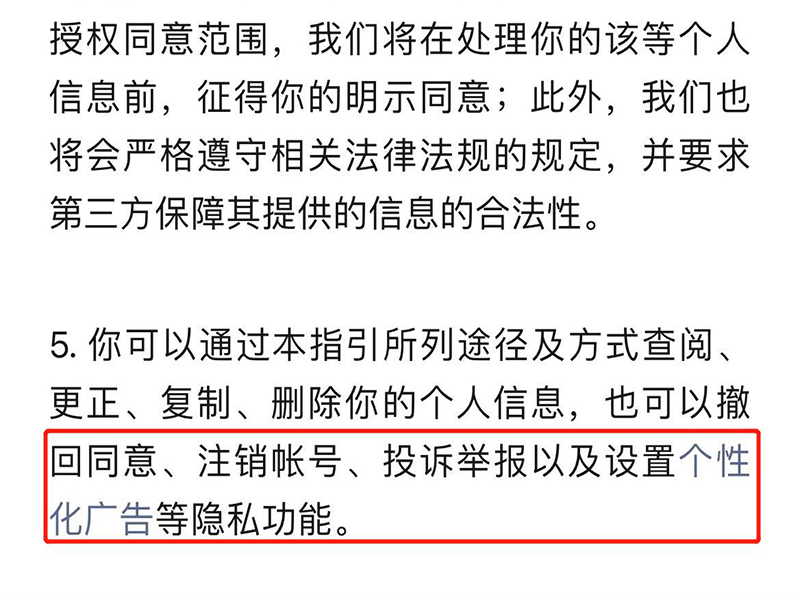 4、在隐私保护指引页面上,往下滑至第5点,点击进入“个性化广告”管理页面。