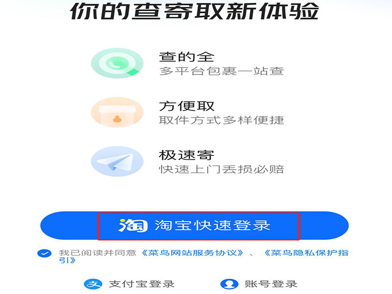 1、打开菜鸟裹裹app,使用个人淘宝或支付宝账号登录进主页面。