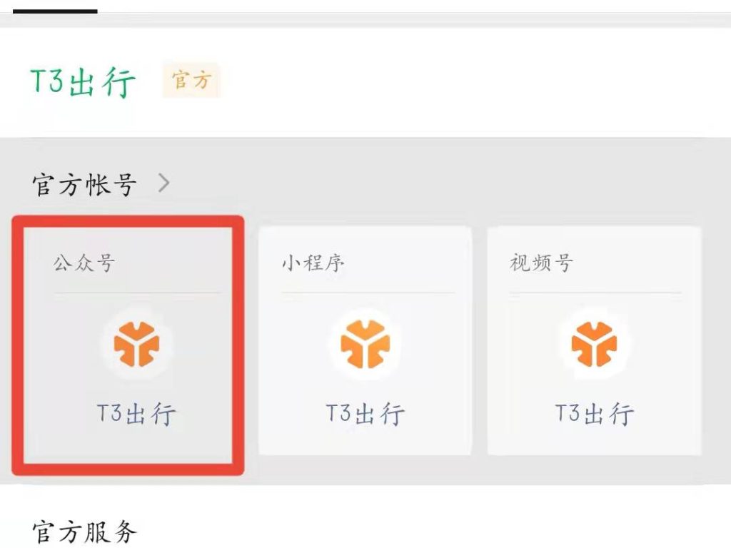 1、打开微信,搜索“t3出行”,点击进入公众号。