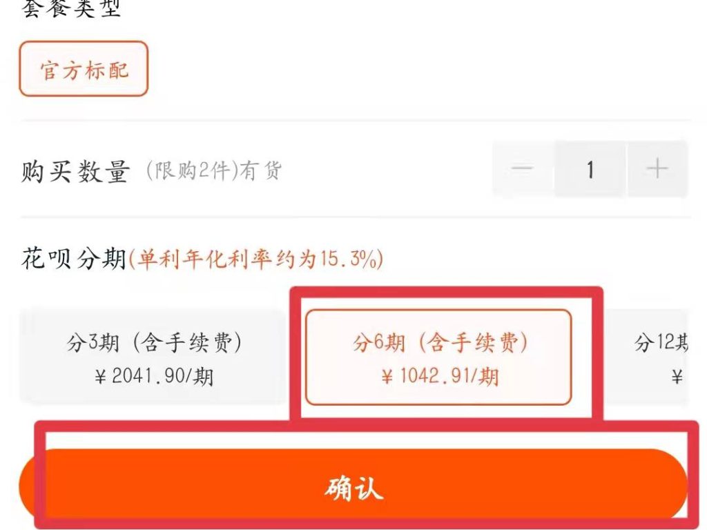 3、点击“花呗分期”下方的分期详情规格,最后点击“确认”,输入密码即可下单。