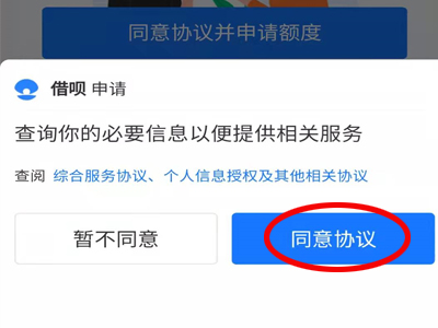 4、回到“我”的界面,找到“借呗”,进入借呗界面,点击“同意协议”即可以查看借呗额度。