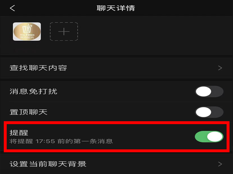 3、在“聊天详情”界面点击“提醒”旁边的符号就可以了。