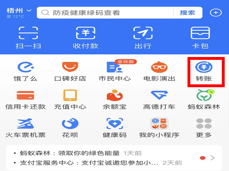 1、打开支付宝app,点击首页的“转账”。