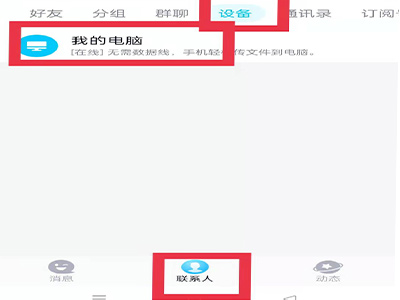 2、打开手机QQ切换到“联系人”页面,选择“设备”、“我的电脑”。