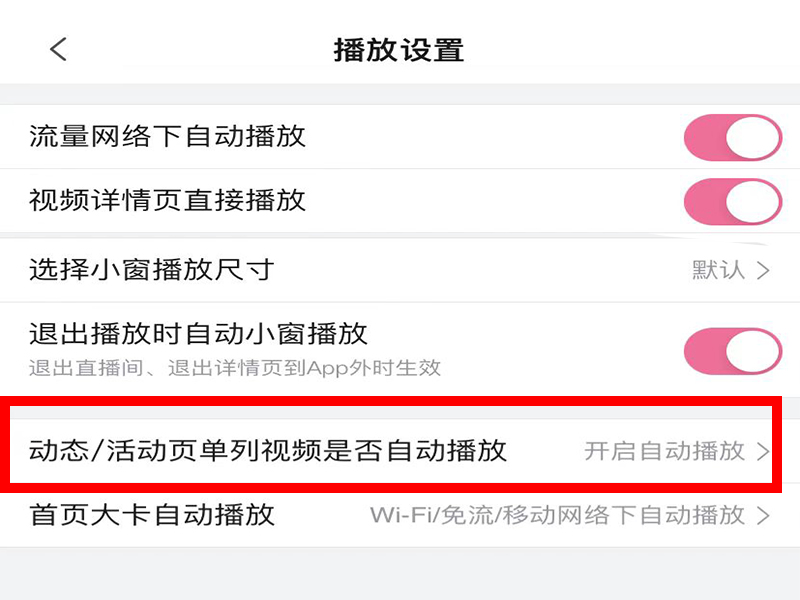 3、进入“播放设置”界面后,点击下方“动态视频自动播放”选项。
