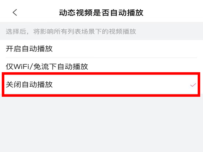 4、进入“动态视频是否自动播放”界面后,点击“关闭自动播放”。