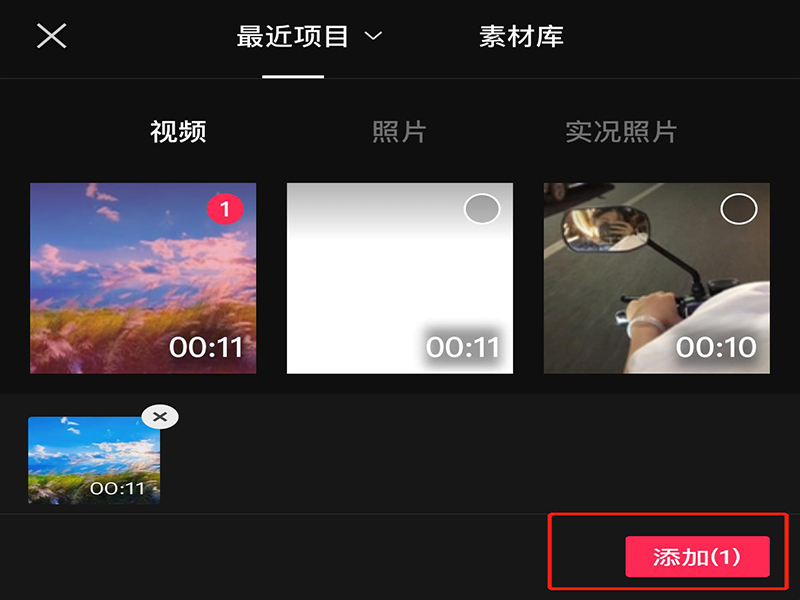3、点击“添加”,将下载好的视频添加到剪辑视频中。
