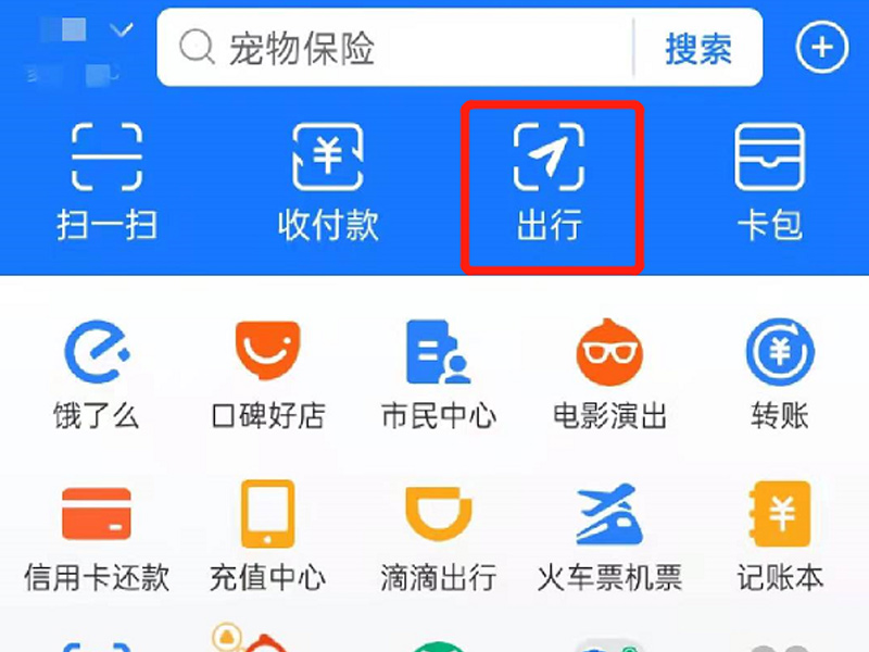 1、打开手机支付宝app,点击“出行”。