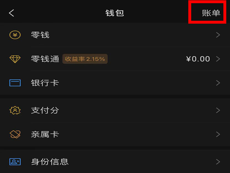 3、进入“钱包”界面后,点击右上方的“账单”。