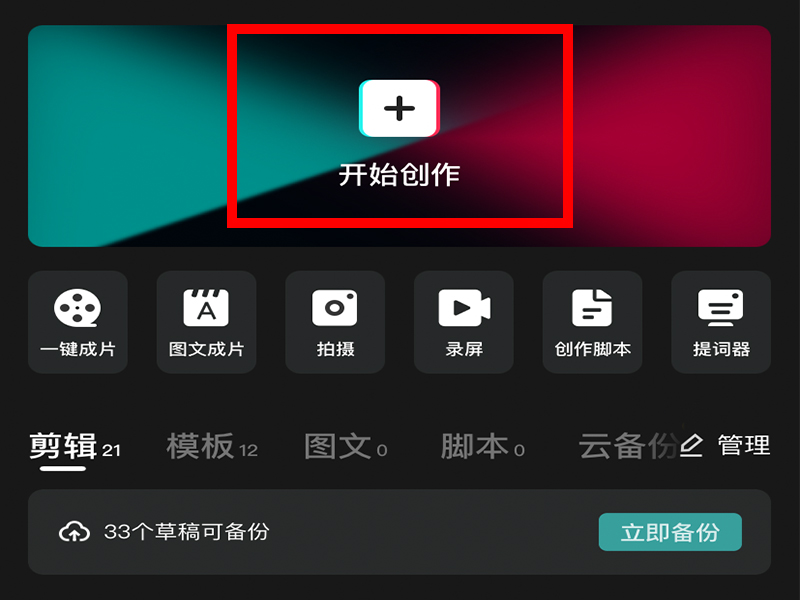 1、打开剪映app,点击屏幕上方的“开始创作”。