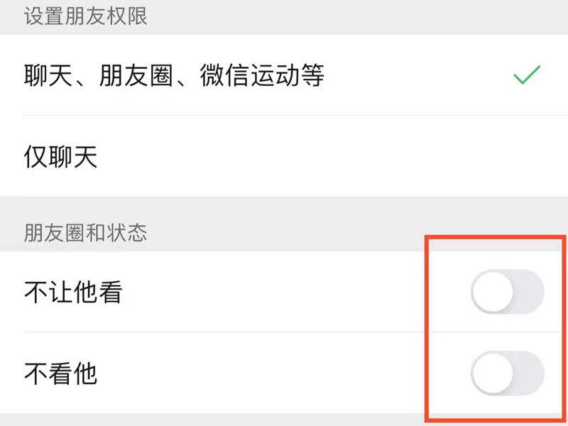 3、选择“聊天、朋友圈、微信运动等”,打开“不让他看”和“不看他”选项开关即可。