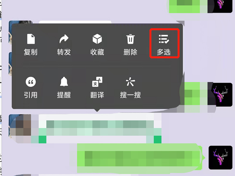 3、进入聊天界面后,长按需要转发的聊天记录,点击多选。