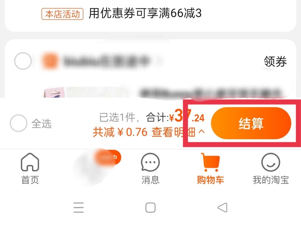 1、打开淘宝,在购物车中选择要购买的商品并点击结算。