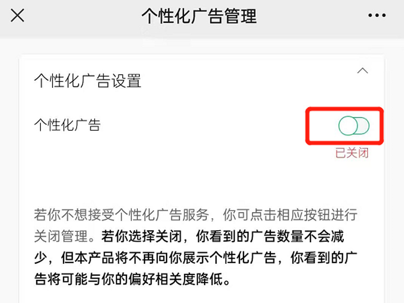 关闭朋友圈的个性化推送广告具体操作如下:1、打开手机微信app,点击“我”,进入个人界面,点击“设置”,进入设置界面。2、在设置界面点击“关于微信”,进入微信版本界面。3、在微信版本界面,点击下方《隐私保护指引》,进入《隐私保护指引》界面。4、在《隐私保护指引》界面找到“个性化广告”,点击进入个性化广告管理界面。5、在个性化广告管理界面关闭个性化广告即可。