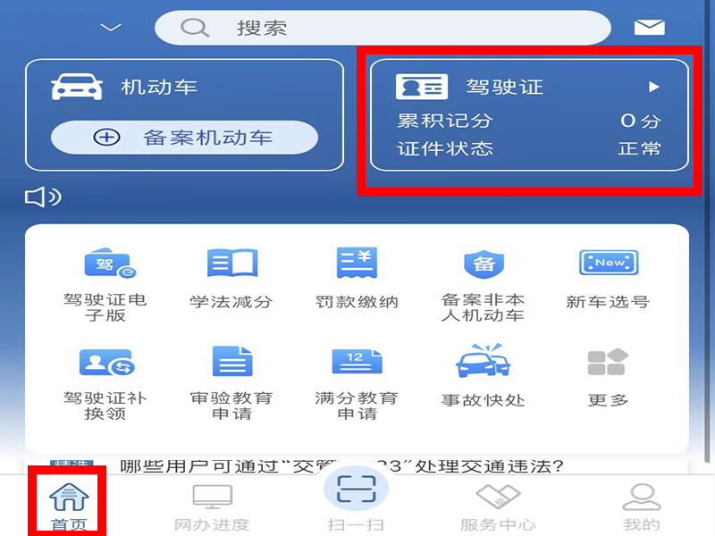 1、打开交管12123app,点击进入“首页”界面,再点击上方的“驾驶证”。