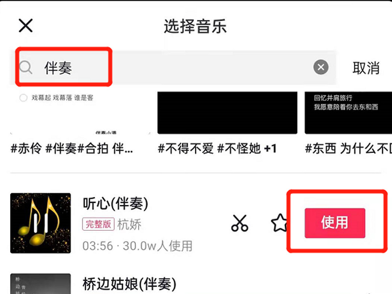 3、搜索“伴奏”,在需要的伴奏中点击“使用”。