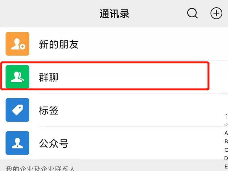 2、点击下方的通讯录后,点击上方的群聊,再选择一个群聊。