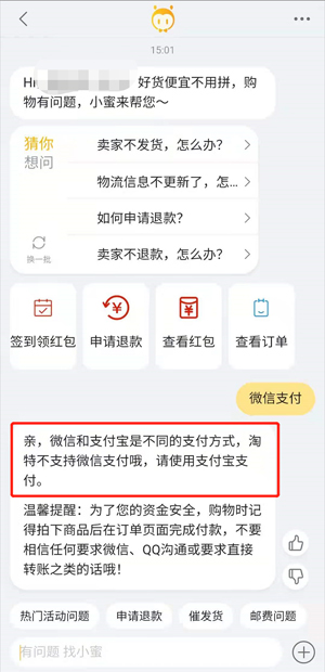 目前淘宝特价版不能用微信支付,下面介绍具体的情况。1、在支付页面无法选择微信支付。2、在“我的”页面点击“客服”。3、点击“联系在线客服”。4、在聊天对话框发送“微信支付”,得到的回复也是无法使用。