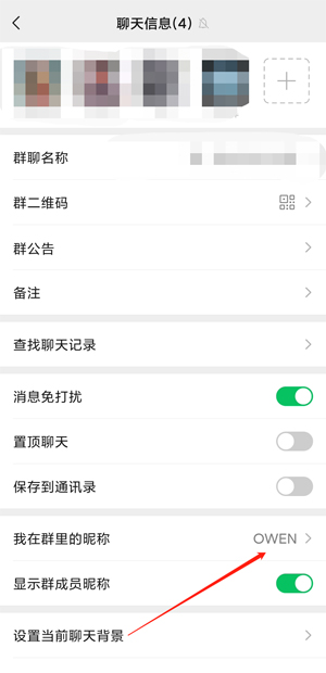 3、向下滑动,找到“我在群里的昵称”,进行修改即可。