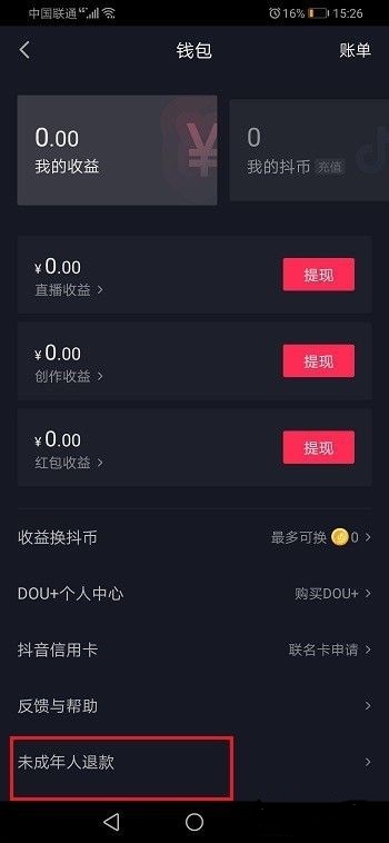 2、进入“钱包”后,点击底部的“未成年人退款”。