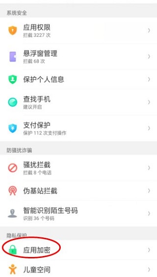 3、在“安全”页面的下方就能找到“应用加密”功能了。