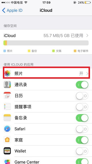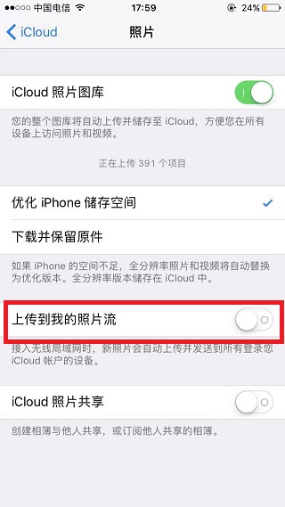 5、关闭“上传到我的照片流”。