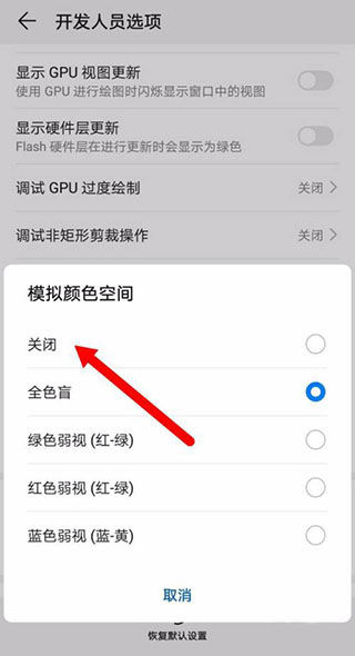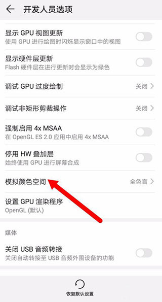 可以通过设置“开发人员选项”里的“模拟颜色空间”来调整。1、在“设置”里进入“系统”。2、选择“开发人员选项”并点击,进入“模拟颜色空间”。3、关闭“模拟颜色空间”,屏幕就可以恢复。
