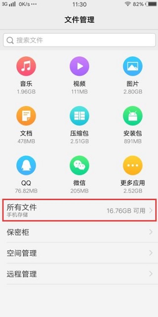 2、点开文件管理即可查看到文件管理中相关设置,点击所有文件。如图: