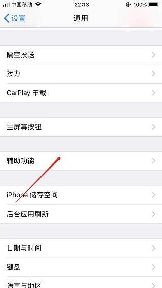 3、在通用设置中找到辅助功能,点击打开辅助功能设置页面。如图: