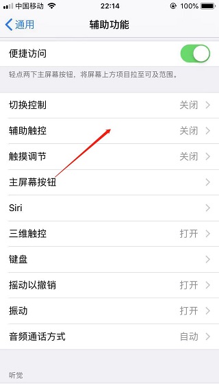 4、在辅助功能设置中有个互动类,再找到辅助触控,默认是关闭的,点击一下关闭位置。如图: