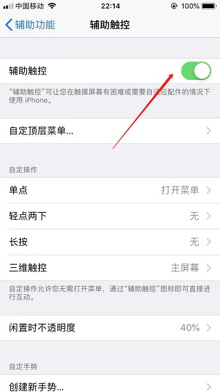 5、在辅助触控中点击打开右侧的开关按钮,就自动打开了,可以看到屏幕上就有悬浮球了。如图: