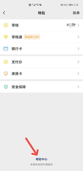 3、然后进入“钱包“界面点击下方的“帮助中心”。如图: