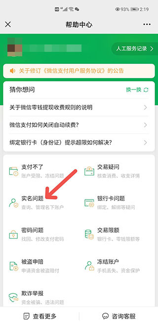 4、在“帮助中心“界面里点击“实名问题”。如图: