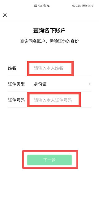 6、进入到“查询名下账户“界面后,开始录入“姓名”和“证件号码”,点击”下一步“。如图: