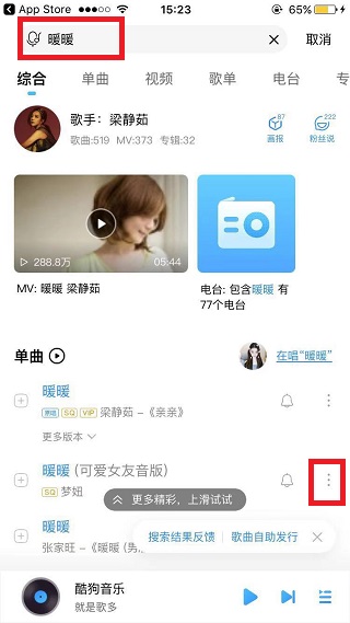 3、打开酷狗音乐,在搜索框输入要下载的歌曲,比如暖暖。