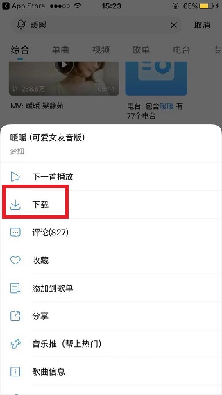 4、选择要下载的歌曲,点击歌曲后面的三个小竖点,选择下载。