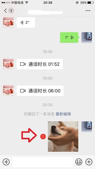 4、点击聊天记录中的红色感叹号, 在弹出的对话框中点击重发。