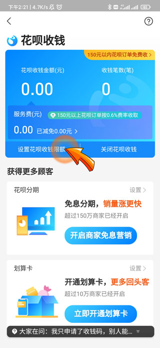 5、最后点击“设置花呗收钱额度”选型即可设置额度。