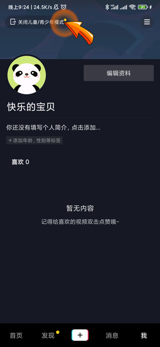 2、然后点开我的页面左上角的“关闭儿童/青少年模式”选项。