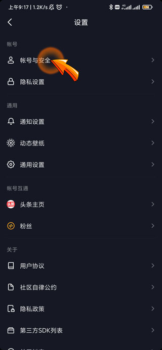 4、进入设置页面后点击“账号与安全”选项。