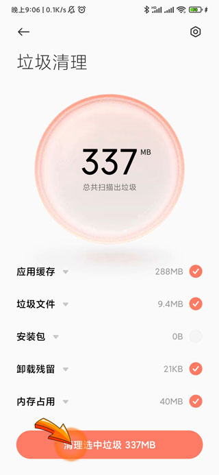 3、手机检查出垃圾后,点击页面底部的“清理选中垃圾”选项即可。
