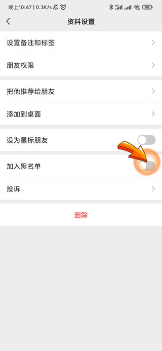 3、最后点击打开“加入黑名单”右侧的开关按钮即可。