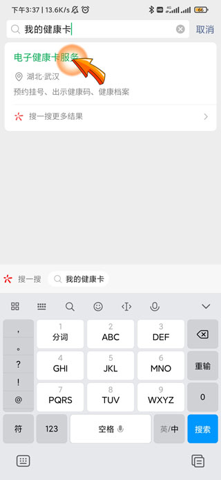 2、然后在搜索栏中输入“我的健康卡”,之后点击下方的“电子健康卡服务”选项。